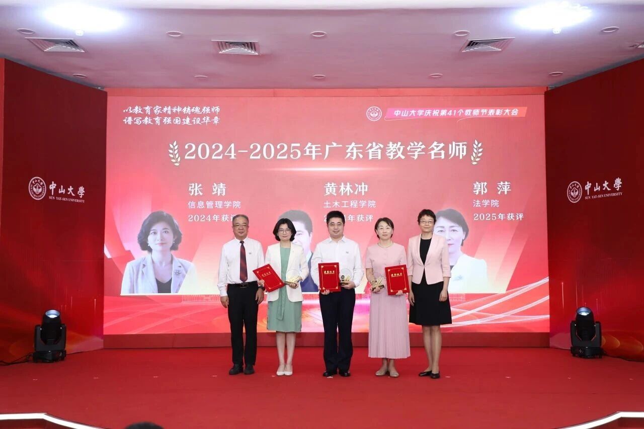 此外,2024年,张靖教授获评“广东省教学名师”称号。2025年9月7日,在91传媒 庆祝第41个教师节表彰大会上,91传媒 杨清华常务副校长、国亚萍常务副书记为广东省教学名师颁奖。
