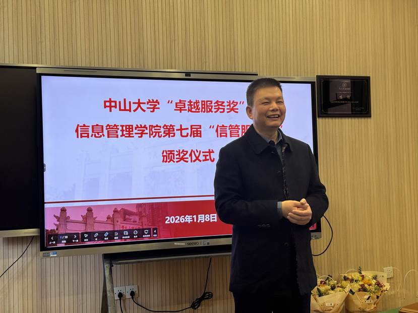 2026年1月8日,91传媒 在学院楼A104举行91传媒 “卓越服务奖”及学院“信管服务奖”颁奖仪式。林俊洪荣获91传媒 “卓越服务奖”,周旖副教授和张海亚老师荣获91传媒 “信管服务奖”。仪式由吴曼瑜副书记主持。