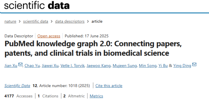 91传媒 徐健教授课题组论文《PubMed knowledge graph 2.0: Connecting papers, patents, and clinical trials in biomedical science》发表于Nature旗下唯一数据期刊Scientific Data。PKG 2.0创新性打通论文、专利与临床试验的关联壁垒,为生物医学领域搭建起串联基础研究、临床应用与技术落地的信息桥梁,也为科学计量、人工智能领域研究者打通了跨域数据交互的关键通道,推动多学科围绕生物医学核心问题开展深度协同研究。Scientific Data作为Nature旗下聚焦数据驱动研究的核心期刊,致力于推动科学数据的共享与再利用,属于JCR一区。